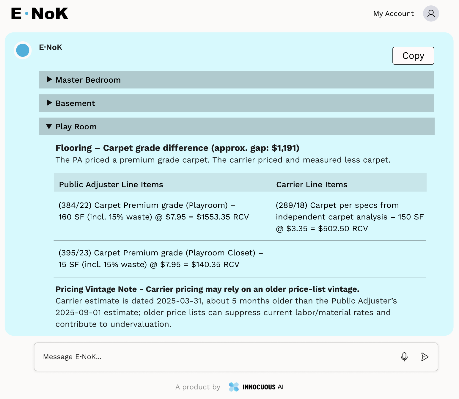Enok is a convenient tool for public adjusters (PAs) to understand key discrepancies in their estimate comparisons rapidly.